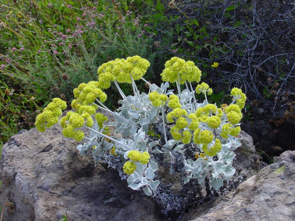 Santa Cruz Island buckwheat (Eriogonum arborescens) – Island endemic with a long nectar season for bees and butterflies; dried flower heads persist for structure. Prefers rocky, fast-draining soils and minimal summer water. Conservation Status: Not of concern. Jepson eFlora