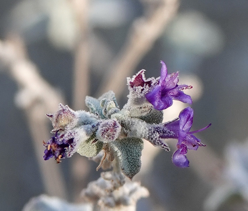 Desert lavender (Condea emoryi) – Fragrant shrub of washes and canyons; swarmed by bees, butterflies, and hummingbirds. Handles intense sun and wind; light pruning after bloom keeps it dense. Conservation Status: Not of concern. Jepson eFlora